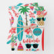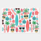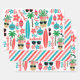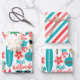 Tropical Christmas wrapping paper features three sheets total - two with the same pattern of surfboards, palm trees with string lights, decorated pineapples, hibiscus flowers, sunglasses, ornaments and the Hawaiian greetings "Mele Kalikimaka" and "Aloha". The third sheet is a diagonal stripe pattern in turquoise, coral and pink. Perfect for beach, coastal, island and surfing themes. Original artwork KL Stock.