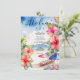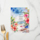 Elevate your beachside celebration with this beautifully designed wedding menu, perfect for a tropical destination affair. Set against a dreamy backdrop of painted beach umbrellas, this 4.5" x 6.25" menu invites your guests to indulge in a feast as vibrant as the setting. Surrounding the scene are delicate hibiscus flowers in stunning shades of orange and pink, adding a splash of tropical charm. This menu not only highlights your delectable wedding day fare but also complements the serene ambiance of your beachside celebration. Fully customisable to match your unique style and menu choices.
