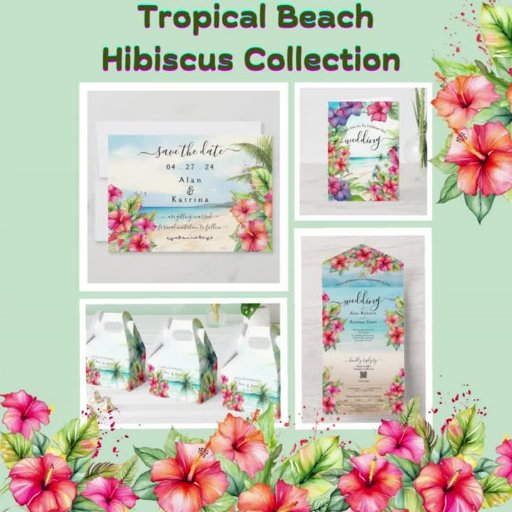 Celebrate your tropical paradise with the Tropical Beach Hibiscus Wedding Menu. This enchanting menu card features a picturesque beach scene complete with charming beach umbrellas, all rendered in a vibrant watercolor style. The tranquil blue waters and soft sandy shore set a relaxing tone, while vivid pink and red-orange hibiscus flowers add a splash of tropical elegance. This menu card beautifully complements your tropical-themed wedding and provides a stunning presentation for your wedding feast.