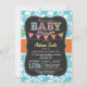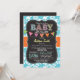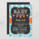 Neutral baby shower invitation with cute chalkboard look font on colourful orange and bright blue and white tropical hibiscus pattern. Vintage feel chalk fonts on cool blackboard background with colourful pink, orange, purple, and green bunting flags. Neutral baby shower invite for baby boy or girl!