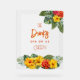 Opaque acrylic bar sign for a tropical themed wedding reception or other event. Yellow and orange hibiscus flowers and big leaves decorate this 8x10 inch sign with red-orange text. Purchase with a wooden holder, or not.