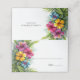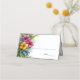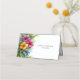 A tropical Hibiscus wedding table place card that includes the bride and groom's names along with their wedding date.