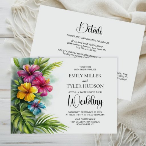 A tropical hibiscus wedding RSVP response card to include with your invitation for your guests to confirm their attendance on your special day.