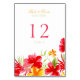 Wedding table number card template featuring a retro tropical theme with illustration of colourful hibiscus flowers on bright red, orange and green. Suitable for summer / Hawaiian / outdoor / garden ceremonies or other tropical or exotic weddings.