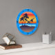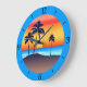 Clock in an image of a tropical island with palm trees, against an orange sunset and turquoise ocean, with turquoise border