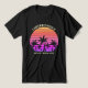 Cool matching family vacation tri-blend t-shirts for an island cruise. Features beautiful palm trees in front of a pretty pink beach sunset. Perfect custom black tees for your summer trip to the sea.