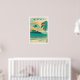 Retro style hand painted vintage style travel poster of Maui in Hawaii. Features aqua blues and greens, with sandy tones and Palm trees.