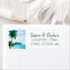 Dreamy palm trees on a beach with island mountain background return address label in green, blue, aqua and tan and beachy fonts. Great for beach destination wedding invitations!