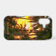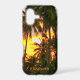 Modern tropical abstract image is covered with tall palm trees and tropical fauna. Colourful sunset colours in the background boast shades of golden yellow, orange and purple. Monogram with custom name, text or initials. Text is in orange, but may be easily changed in design tool section.