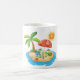 A tropical island picnic scene with a turtle and hot sun. This design looks really effective on these Mug