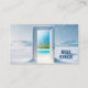 A doorway in a snowy landscape reveals a vibrant tropical beach, with snowflakes gently falling around it, contrasting the warm scene inside for a travel agent.