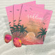 The mouth-watering colours of a summer fruit salad, from melon and peach through apricot and raspberry, give the pieces in this matching design set some of it's irresistible appeal... the beautiful island palm trees, palm fronds, delicate birds in the sky and giant sunrise over sparkling water easily provide the rest. The arch-shaped wedding invitation shown here features all of the above as well as a palm tree shadow on sand for a striking flip side. Search ID581 to see the matching products and other colour options for this design.