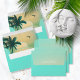 The thirst-quenching colours of teal, butter yellow and sea green give the pieces in this mix 'n match design set some of it's irresistible appeal... the beautiful island palm trees, palm fronds, delicate birds in the sky and giant sunrise over sparkling water easily provide the rest. The wedding envelopes shown here features all of the above as well as a template to add your names and return address. Search ID581 to see the matching products and other colour options for this design.