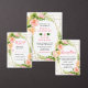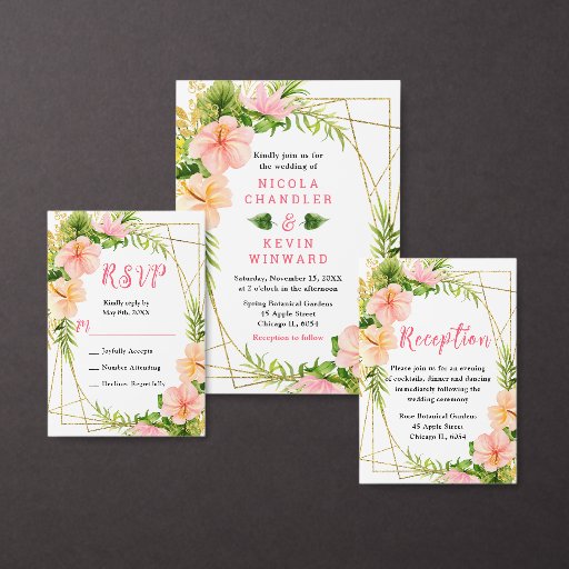 This beautiful and elegant wedding menu features watercolor pink and orange hibiscus flowers and foliage. The text combines handwritten script and serif fonts for a stylish and modern look. This is perfect for a summer tropical wedding.