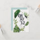 Modern and informal wedding Save The Date card featuring a beautiful illustration of green tropical jungle leaves. Easily add your ceremony date and the bride and groom's names in dark grey fonts over a geometrical white shape background.