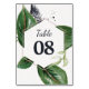 Modern and fashionable table number featuring a beautiful illustration of green tropical jungle leaves. Easily edit your details in contemporary dark grey fonts over a geometrical white shape with a trendy golden frame (faux gold - printed).