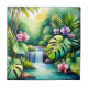 Escape to a lush tropical paradise with this breathtaking watercolor illustration of a hidden jungle waterfall. Vibrant pink and purple orchids bloom among oversized monstera and palm leaves, framing a gentle cascade flowing into crystal-clear turquoise waters under soft golden sunlight. The rich greens, serene blues, and delicate floral details create a tranquil, exotic mood that brings the refreshing beauty of a rainforest retreat right to you.