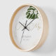 An elegant, personalised wedding anniversary keepsake clock with a tropical theme, featuring a monstera tropical leaf with two small branches of hand-drawn white orchids, delicate myrtle leaves layered digitally with gold and elegant, classic wedding typography. . A nice custom wedding gift for a young - and young at heart - couple celebrating their 1st, 3rd, 5th, 10, 25th or 50th anniversary.