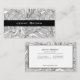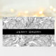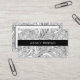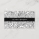 Monochrome tropical leaves background with a black stripe in the middle holding a sans serif font monogram. The back side has a monochrome tropical leaves border with personal info in a sans serif font on white background.