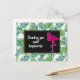 A postcard with customisable text which says: sending you some happiness. Designed with a green tropical leaves pattern and a black frame with a gold border layered over top. A pink flamingo illustration adds a touch of whimsy.