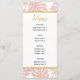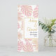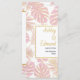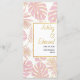 Tropical leaves pink and gold wedding menu card. This pretty design features leaves of Split Leaf Philodendron (Monstera deliciosa) or Swiss Cheese Plant and palm leaves in blush pink with gold outline. Your wording is in a white frame with gold outline.