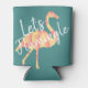 Trendy tropical can cooler with a yellow pineapples patterned pink flamingo and the phrase "Let's Flamingle".