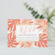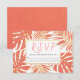 Tropical living coral and gold leaves wedding RSVP response card. This modern design features leaves of Split Leaf Philodendron (Monstera deliciosa) or Swiss Cheese Plant and palm in coral with gold outline. A white frame holds your text. The back includes a gold polka dot pattern on coral background.