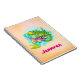 A spiral notebook with a cute illustration of a green tropical lizard surrounded by leaves and flowers on a turquoise blue colour.