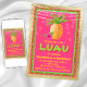 Luau party invitation with preppy pineapple and hibiscus on a beautiful hot pink, lime green and gold foil background with string lights. This luau birthday party invitation is easily customised for your event by simply adding your details in the font style and wording of your choice. This is a printed design with no real foil, glitter, etc.