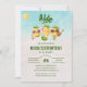 The invitation showcases a picturesque beach backdrop with turquoise waters and sandy shores. A charming, hand-drawn pineapple wearing a party hat takes centre stage, adding a playful and tropical touch. The colours and lush greenery capture the essence of a tropical paradise, setting the stage for a memorable celebration.