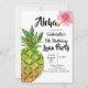 Tropical Luau celebration for any age birthday party. This invitation has a large watercolor pineapple off to the side with a pink hibiscus off the corner. Personalise with your party information.