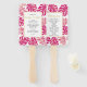 Tropical magenta pink and gold leaves wedding program hand fan featuring leaves of Split Leaf Philodendron (Monstera deliciosa) or Swiss Cheese Plant and palm leaves in fuchsia pink with gold outline. Your text is in a white frame.