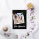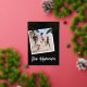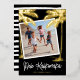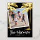 Modern hawaiian christmas card featuring a stylish black background, a square family photo, real gold foil palm trees, the seasons greetings "mele kalikimaka", and your family name. The foil in this design can be change to silver or rose gold.