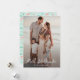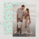 Hawaiian photo Mele Kalikimaka card featuring a photo on the front and a pink and green tropical pattern with lotus and pink flamingos at the back.