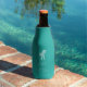 Commemorate your wedding in tropical modern style with these wedding favour bottle coolers, featuring a pair of palm tree silhouettes in black, with the couple's names, wedding date and location beneath. A beachy turquoise aqua background adds summery coastal flair.