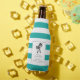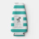 Commemorate your wedding in tropical modern style with these wedding favour bottle coolers, featuring a pair of palm tree silhouettes in black, with the couple's names, wedding date and location beneath. A beachy turquoise aqua and white striped background adds summery coastal flair.