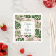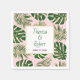 Green and gold tropical leaves blush pink wedding paper napkin. This outstanding design displays leaves of Split Leaf Philodendron (Monstera deliciosa) or Swiss Cheese Plant and palm leaves in green with gold outline on blush pink. A white frame with gold outline holds your text. Choose it for your tropical coastal beach or destination wedding.