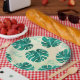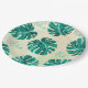 Big palm Hawaiian tropical leaves and aloha handwriting style script over a watercolor washed cream ivory background decorative paper plates for your summer beach parties.
