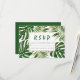 Tropical leaves green and gold wedding RSVP response card. This lovely design showcases leaves of Split Leaf Philodendron (Monstera deliciosa) or Swiss Cheese Plant and palm leaves in green with gold outline. Your text is in a white frame with gold outline. The back includes a gold polka dot pattern on dark green. Choose it for your tropical beach wedding, coastal wedding or destination wedding.