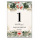 This tropical Table Number features number 1 decorated tropical palm leaves, monstera leaves, golden washes and blooming tropical flowers and peach orchide. Enjoy it.