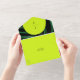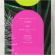 Neon yellow and pink arches over dark palm leaf background with monogram at top over yellow arch. White palm leaf illustration at left and palm tree illustration at bottom right on R.S.V.P. card. R.S.V.P. includes QR code to replace with your own. Outside is neon yellow with black text which includes return address (top flap), "deliver to" script (centre), and address at bottom (back of rsvp).