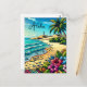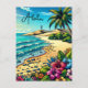 Aloha from our vacation postcard. Pretty tropical coastal shoreline. Pretty blue water, palm trees, tropical flowers and a lighthouse in the background. Ai art done in a comic book pop art style.