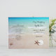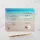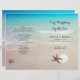 Tropical beach wedding folded ceremony program.  Turquoise ocean water and smooth beach sand is the background for this custom program that will be folded in half.  Casual font in dark grey is easy to customise on four "pages".  Sand dollars and starfish decorate to represent the couple.