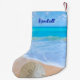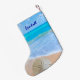 Beach Christmas stocking with name and design on both sides. Hang this pretty stocking facing left or right. Tropical blue ocean water, beach sand and a realistic sand dollar image decorates both sides. Name is in purple-blue script and will print on both sides.