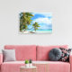 Landscape canvas photo print of a hanging palm tree on a white sand beach on a small desert island in the blue lagoon of tropical Rangiroa, an atoll in the Tahiti archipelago French Polynesia in the Pacific Ocean.