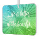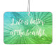 Tropical palm leaf photo green Emerald Sea car air freshener. Personalise with your own inspirational quote or name. Double sided design. Great scents for car, home, hotel, bathroom and other places. Upload your own beautiful pictures optionally. Life is better at the beach. Custom design with choice of fresh fragrance like Island Breeze or New car. Unique Birthday gift idea for friends and family. Also great as party favour for wedding, event, party and more.