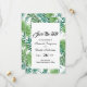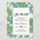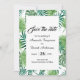An elegant floral tropical greenery save the date for a wedding card. Templates for names and wedding date. An elegant white background, black letters. Watercolored green palm tree leaves and foliage as a frame.