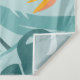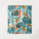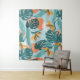 Cool tropical tapestry design with palm leaves, hibiscus, and abstract shapes in green, blue, and brown colours.