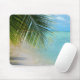 Tropical beach with palm tree leaves and beautiful blue ocean of the Caribbean