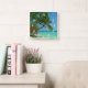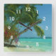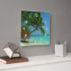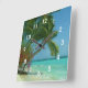 This design is a watercolor painting of a beach scene with palm trees, a flowery bush and the ocean in beautiful shades of blue.